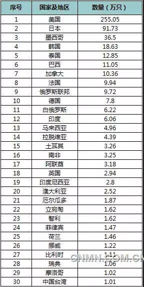 2019年2月,中國(guó)鋁合金車輪共計(jì)出口110個(gè)國(guó)家和地區(qū),數(shù)量≥1萬(wàn)只的有30個(gè)具體數(shù)據(jù)見(jiàn)下表: